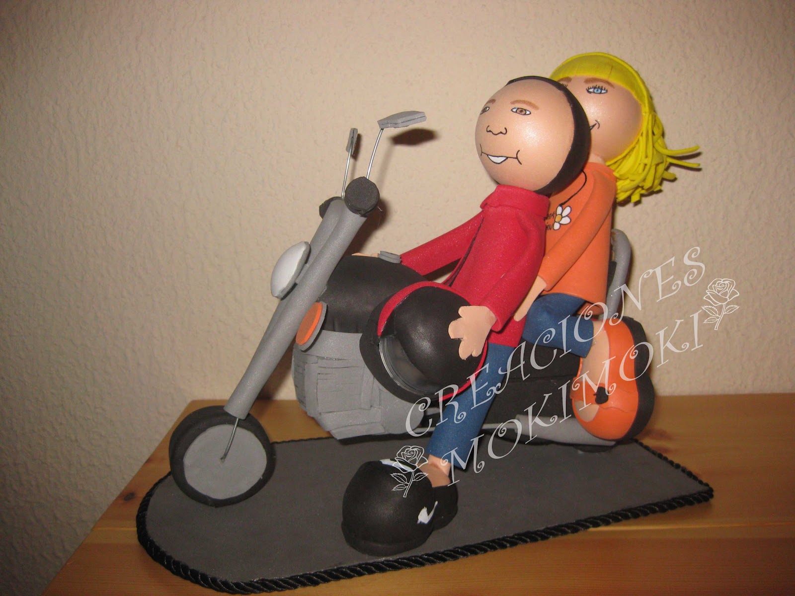 Aquí os traigo una pareja que me ha dado bastante guerra... Si os preguntáis por qué no están vestidos de motoristas... Es porque la persona que me lo encargó, no me dijo que los quisiese así. Sólo disponía de una foto un poco vieja de los que van en la moto... con deciros que en la foto el chico tenía gafas y ahora ya no las tiene... pero me apañé como pude. Y la moto... pues lo único que me supo decir la mujer es que era una moto de paseo negra, pero no de esas tipo harley... así qué, deduje que sería del estilo de la de mi padre... Sólo me pidió que fuese negra... Por lo tanto, con esa información, hice a los fofuchos exactamente con la ropa con la que salían en la foto y así, no les vestía con ropa que no les gustase y la moto... pues le hice unos detallitos... tales como: el radiador y así del motor, un tubo de escape, los retrovisores, que son móviles... y además, le hice un casco que puse apoyado en la moto... en casco lleva hasta el enganche, pero lo puse de tal forma, que al final no se ve... Bueno, espero que os guste... a mí, aunque me ha dado muchísima guerra, me encanta como ha quedado!!!